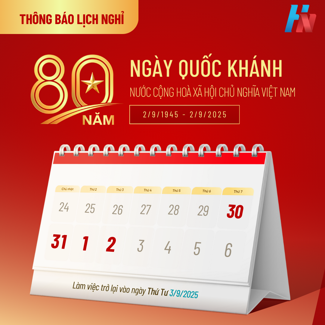 Chúc Quý khách hàng và Quý đối tác một kỳ nghỉ Quốc khánh 2/9/2025 an toàn, vui vẻ và nhiều ý nghĩa!